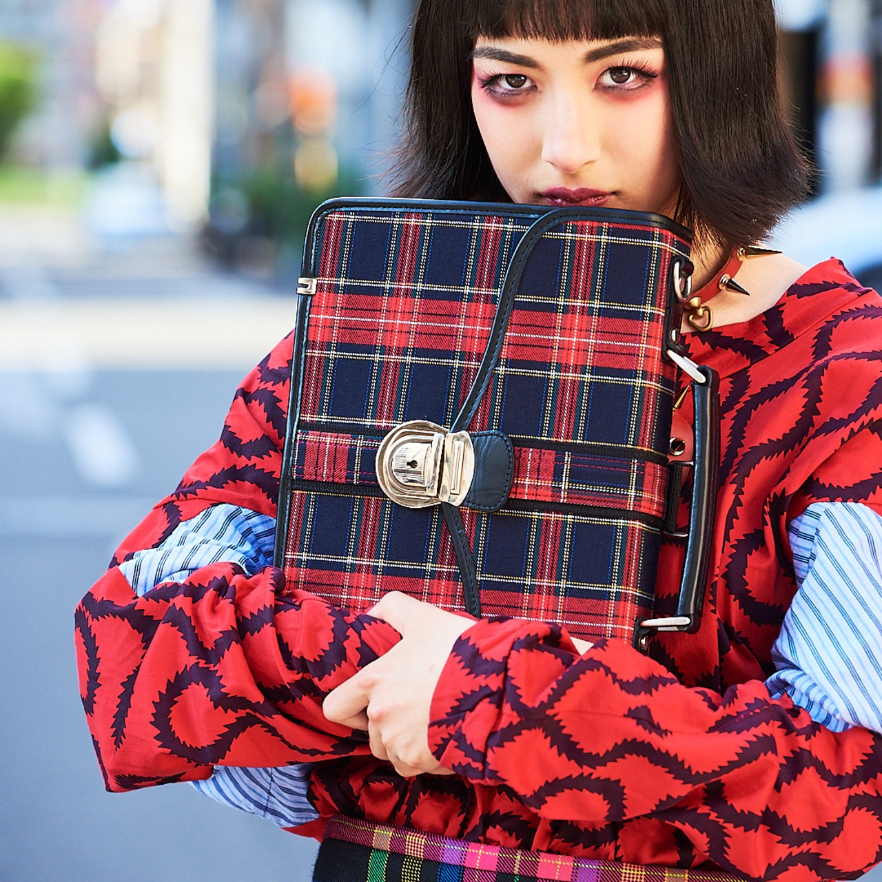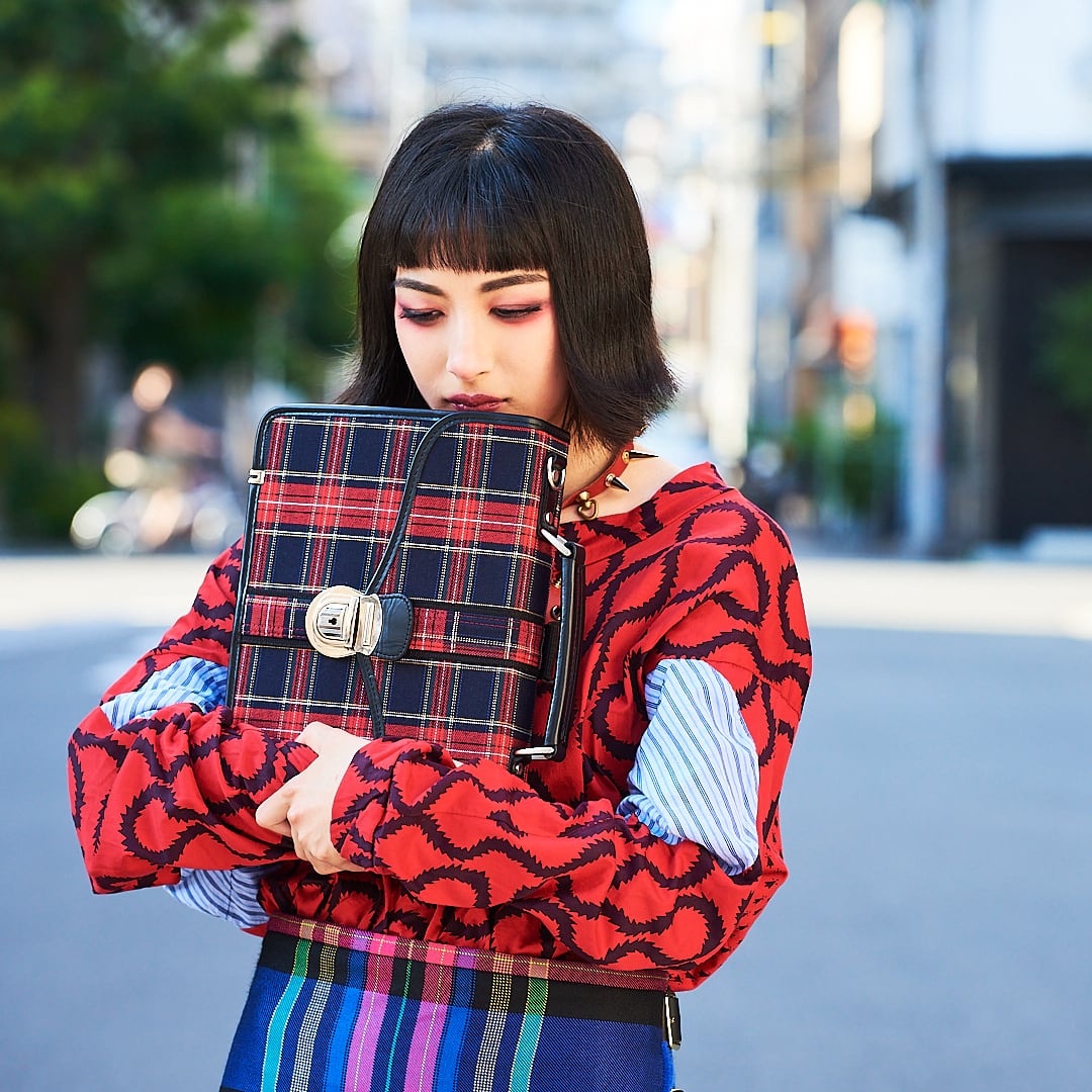 タータンの素材感を感じて頂くため、表面の裏側にPVC加工、さらにボンディング加工と、防水性・引き裂き強度は勿論、生地の自立性も感じて頂けます。